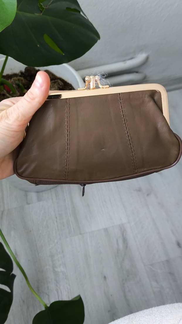 Bej renkte deri cüzdan, tokalı çerçeve ve pürüzsüz yüzey ile vintage ve modern klasik tarzı bir araya getirir.