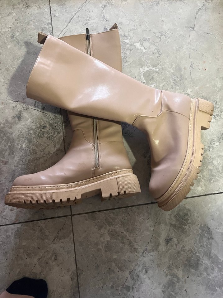 Bej renkte, blok topuklu deri dizüstü kadın çizmesi. Düz ve şık tasarımıyla günlük ve sokak stiline uygun, rahat ve şık bir model.