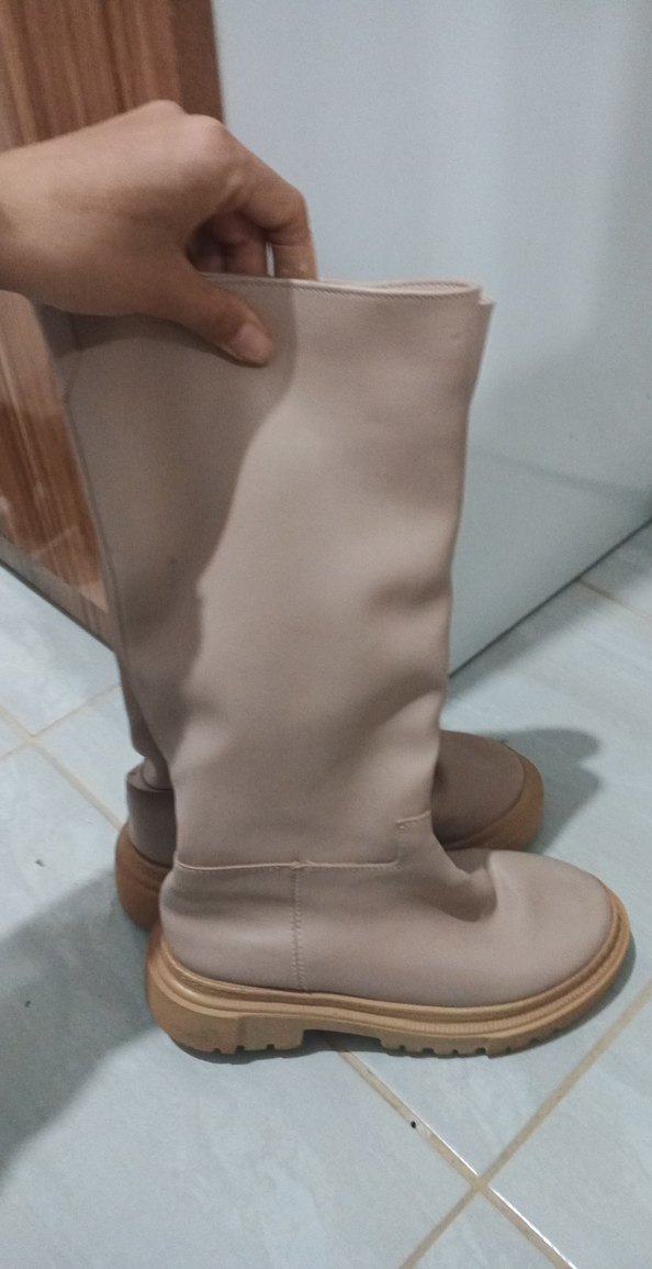 Bej renkli, deri dizüstü botlar blok topuklu olup, minimalist ve normcore tarzı günlük kullanım için uygundur. Rahat ve şık bir görünüm sunar. sadece birkaç defa giyildi herhangi bir deforması yok