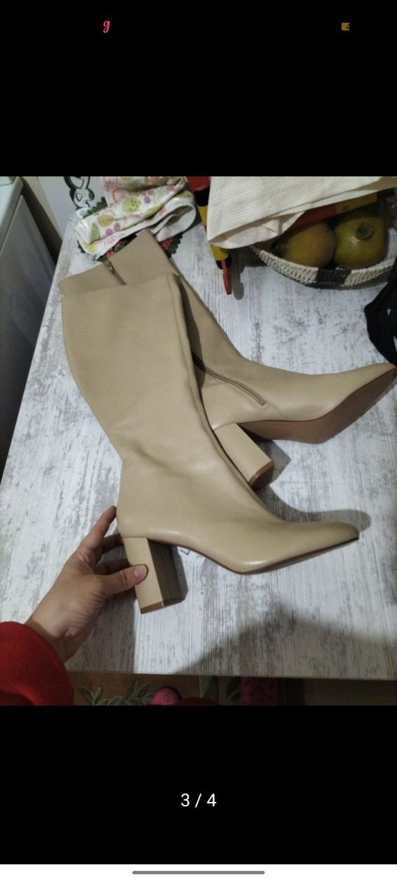 Bej renkli, deri dizüstü botlar blok topuklu ve tokalı detaylıdır. Günlük sokak stiline uygundur.