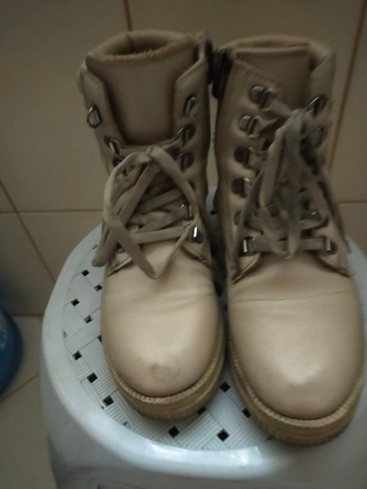 Bej deri kadın botlar, dolgu topuklu ve bağcıklı, tokalı detaylara sahip. Sokak tarzı ve gündelik kullanıma uygun.