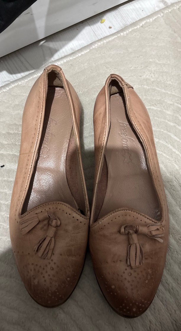 Bej renkte deri kadın dolgu topuklu ayakkabılar, tokalı ve vintage tarzda olup ofis kullanımı için uygundur. Düz, desensiz ve pastel renklidir.