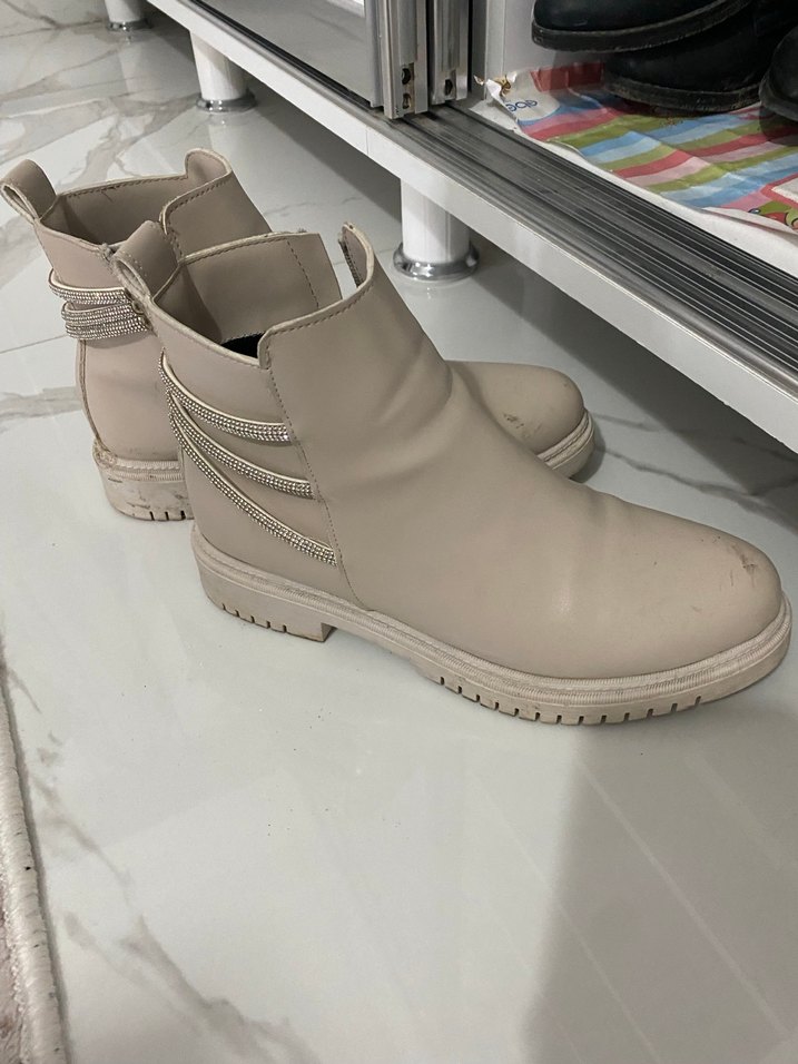 Bej deri, dolgu topuklu ve tokalı kadın botu. Sokak stili ve günlük kullanıma uygun, rahat ve şık görünüyor. Sadece 2 kez giyildi sıfır ayarında