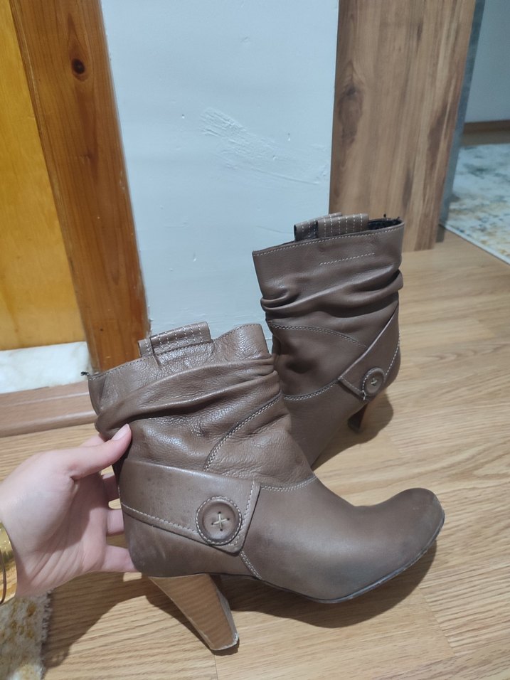 Bej Deri Kadın Dolgu Topuklu Bot
