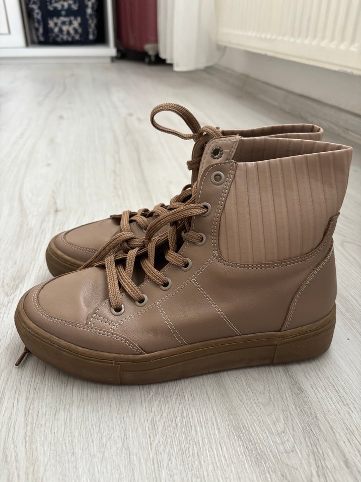 Bej renkli deri kadın botları, dolgu topuk ve düz deseniyle rahat ve şık bir görünüm sunar. Sokak stiline uygun, günlük kullanıma ideal.