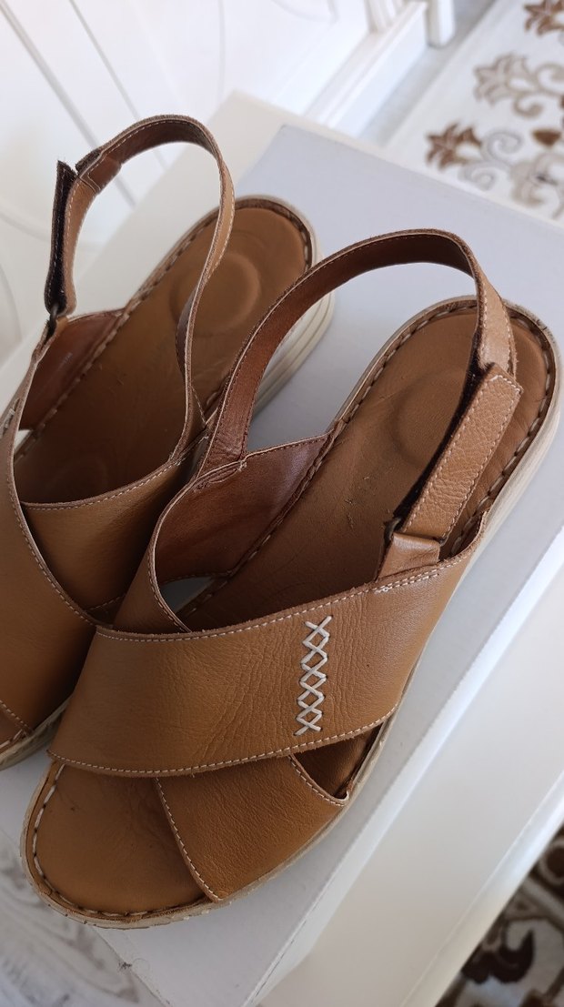 Bej deri kadın sandalet, dolgu topukludur. Parlak ve minimal tasarımıyla günlük şıklık sunar. Umre için almıştım sadece orda giyindim. Ortapedik çok rahat bir sandalet. İhtiyaç fazlası olduğu için satıyorum.