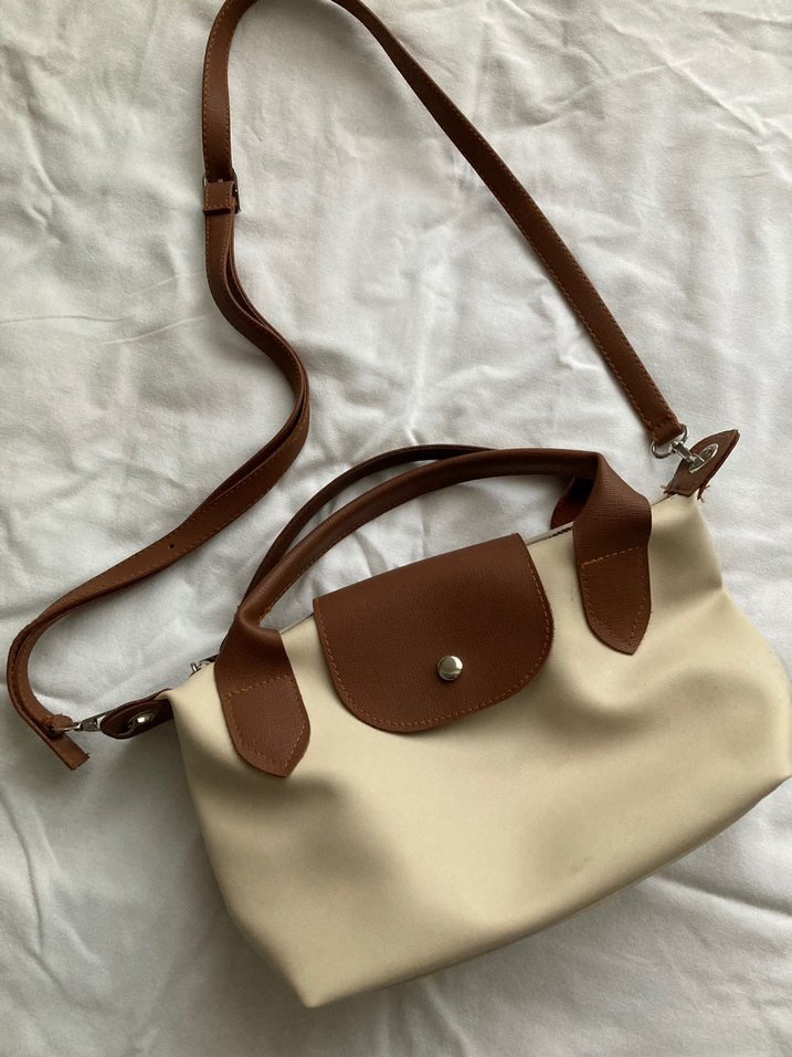 Bej deri kadın el çantası, çıkarılabilir askı ve ön kapaklı sade tasarıma sahiptir. Günlük sokak stili için şık ve kullanışlıdır.