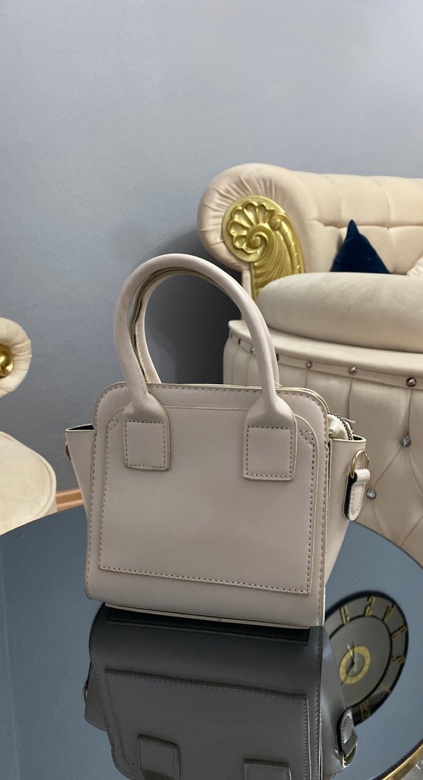 Bej renkli deri, tokalı kadın el çantası. Minimalist ve modern klasik tarzda, günlük kullanıma uygun, desen içermeyen sade tasarım.
