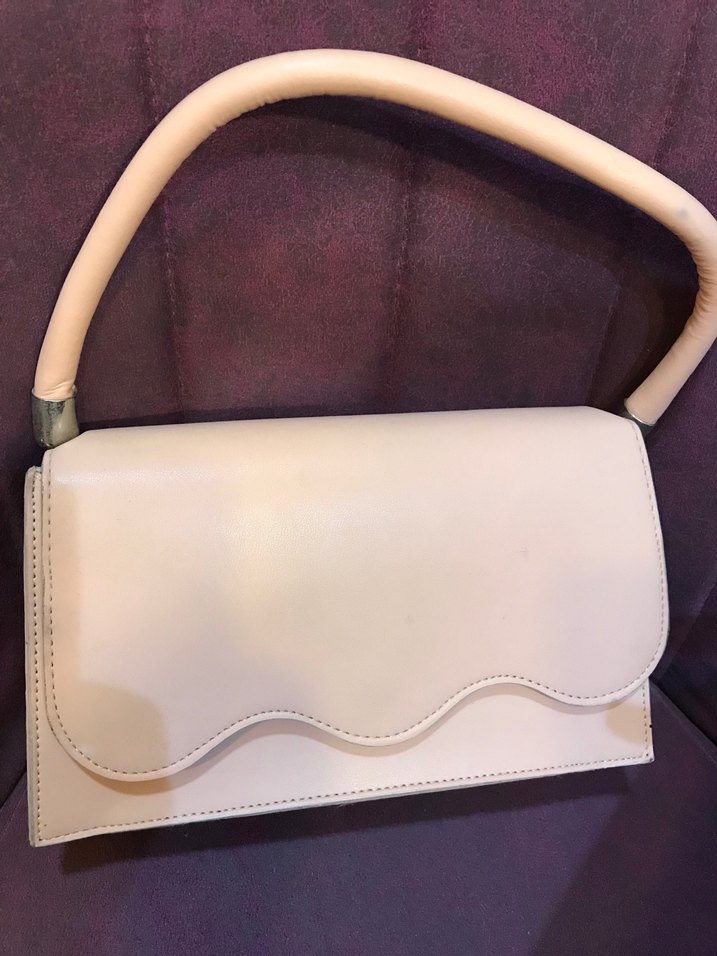 Bej renkli deri kadın el çantası, tokalı detaylara ve desen içermeyen düz yüzeye sahiptir. Pastel tonu ve modern klasik stili günlük kullanıma uygundur.