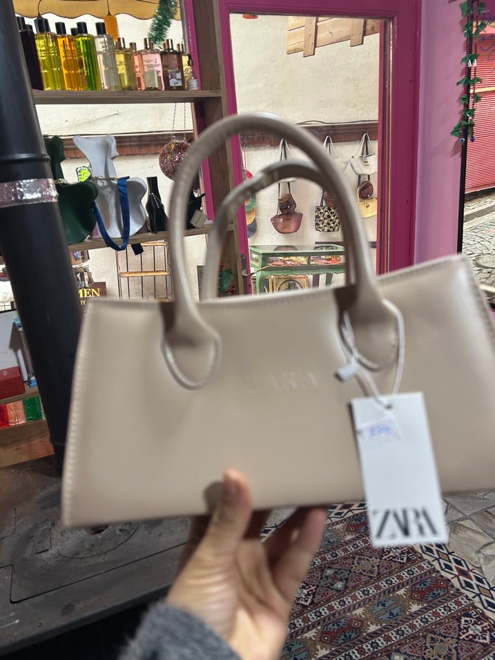 Bej renkte deri kadın çantası, çağdaş tasarım, tokalı detaylar ve baskılı desen içerir, günlük kullanım için uygundur. Zara marka