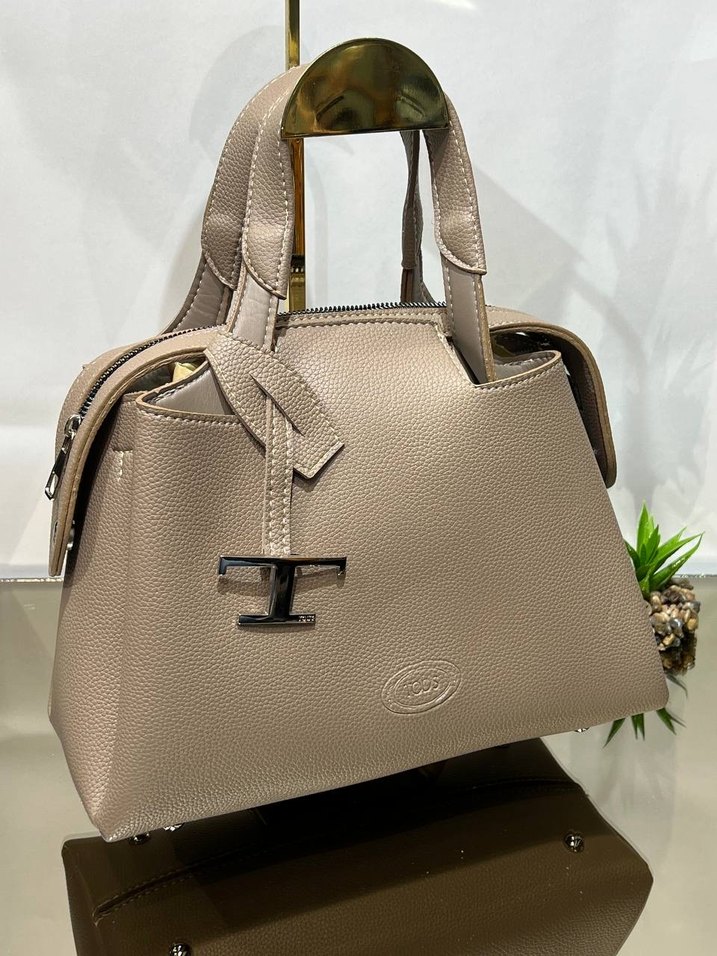Bej deri kadın el çantası, fermuarlı kapama ve baskılı desenle günlük kullanıma uygun çağdaş ve klasik şıklığı bir araya getirir.