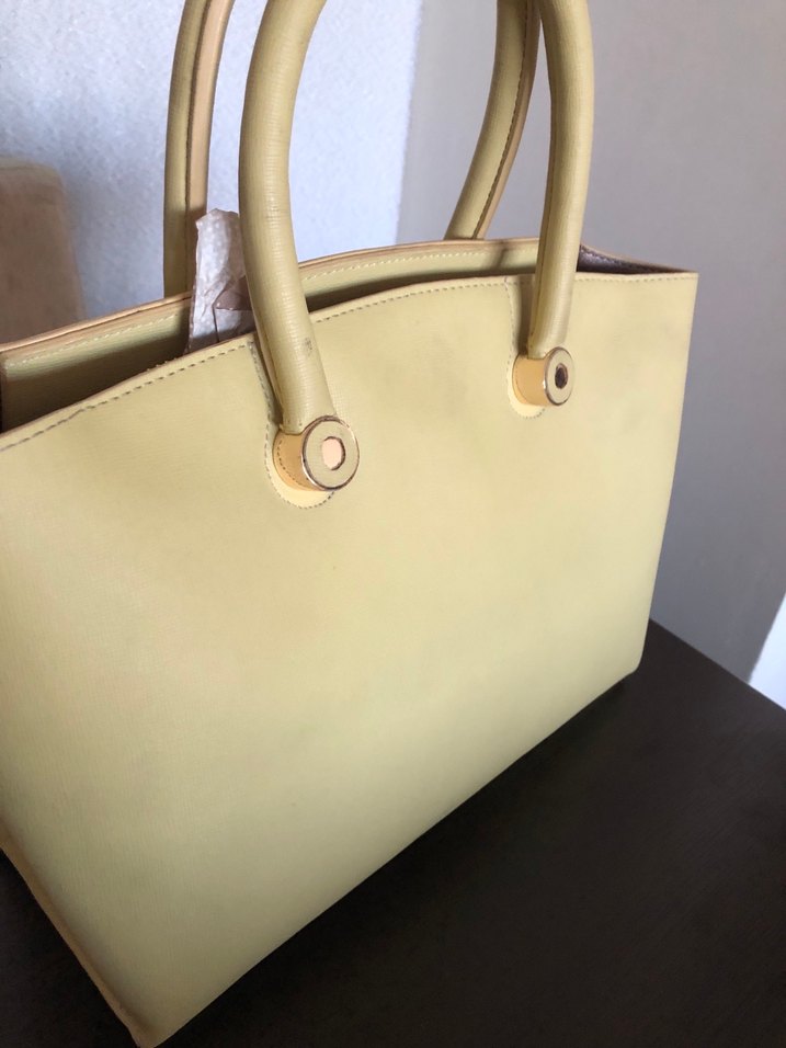 Bej deri kadın el çantası, minimal desenli, yuvarlak saplı, çağdaş ve zahmetsiz şıklık sunar.