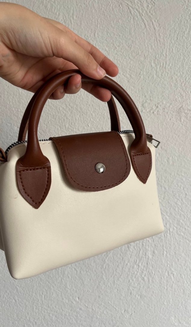 Bej deri, tokalı kapaklı ve koyu kahverengi saplı kadın el çantası, modern klasik tasarıma sahiptir. Askısıda var