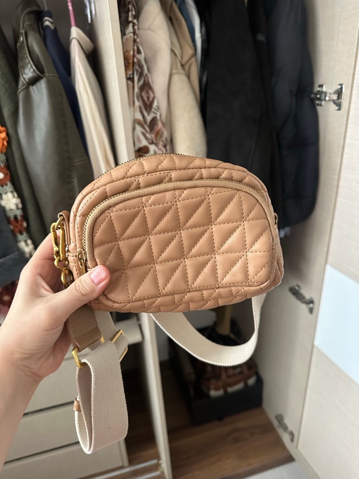 Bej deri çanta, kapitone desenli ve kemerli detaylı, çıkarılabilir askılı, günlük sokak stili için uygun.