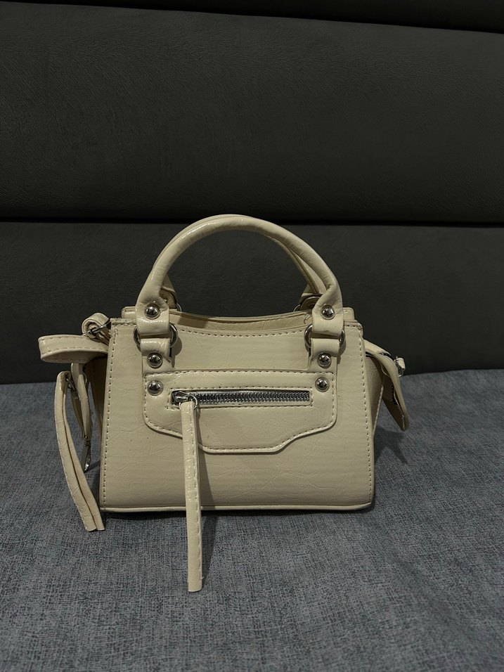 Bej renkli deri kadın el çantası, tokalı tasarımı ve ön cep fermuarıyla sade ve günlük kullanıma uygun bir modeldir.
