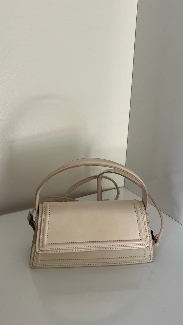 Bej deri kadın el çantası, sade ve desen içermeyen minimalist tasarıma sahiptir. Günlük kullanım için çağdaş ve şık bir görünüm sunar.