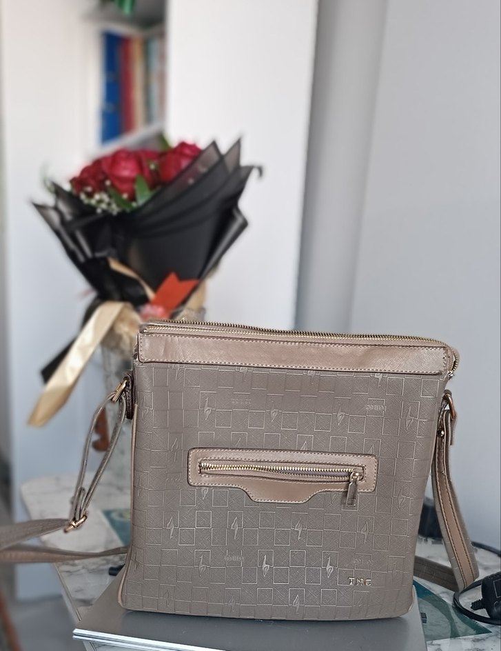Bej renkli deri kadın çantası, fermuarlı cep ile günlük kullanım ve modern sokak stiline uygun, desensiz ve hafif dokulu.