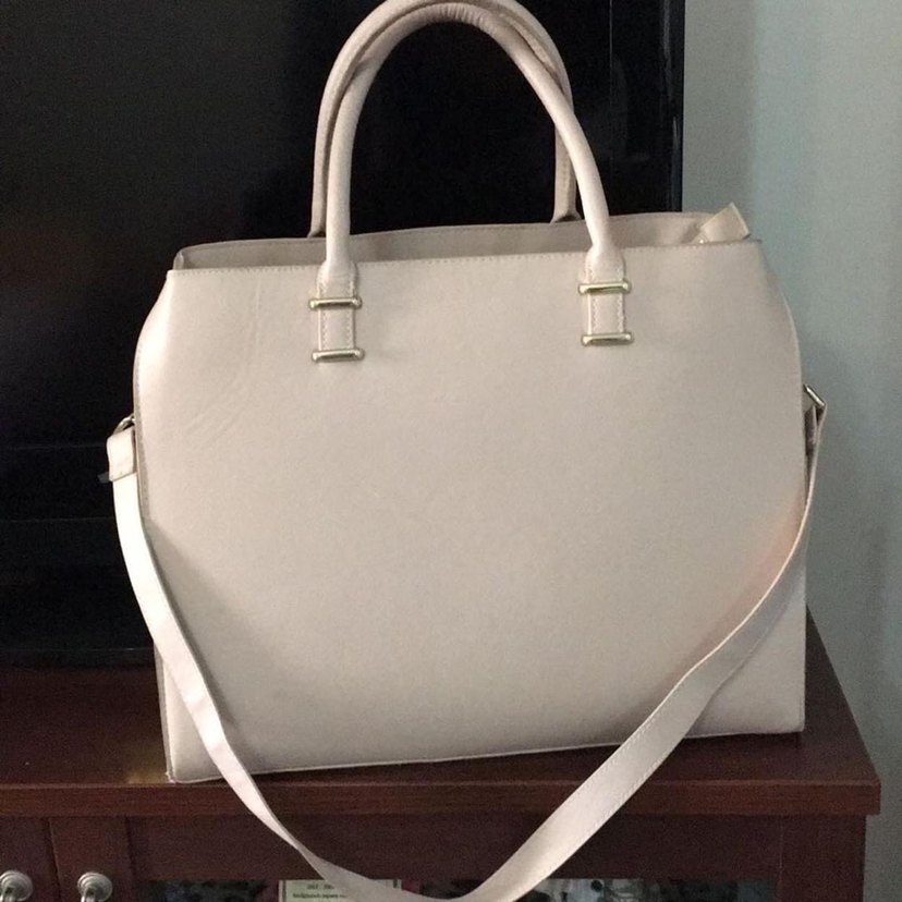 Bej deri, fermuarlı kadın el çantasıdır. İş ve günlük kullanıma uygun, çağdaş ve desensiz tasarıma sahiptir. Pastel tonlarda klasik şıklık sunar. Sol üstte hafif bir ezilme var ama çok belli olmuyor. İyi çok geniş seyahat için de uygun.