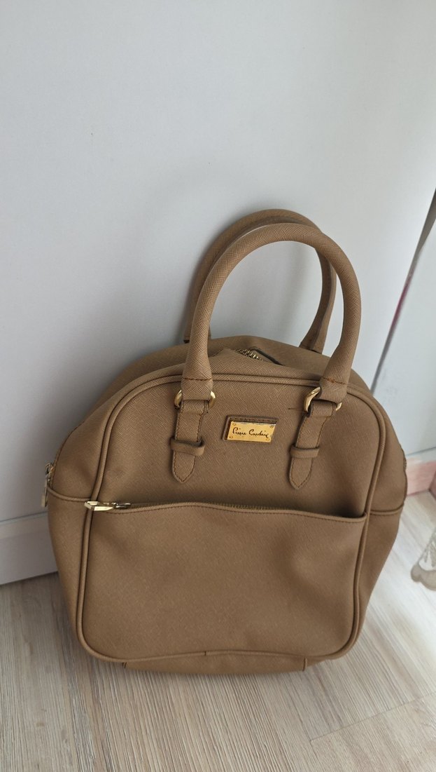 Bej renkte, deri malzemeden yapılmış, fermuarlı bölmeleri olan sade ve desen içermeyen kadın el çantası.