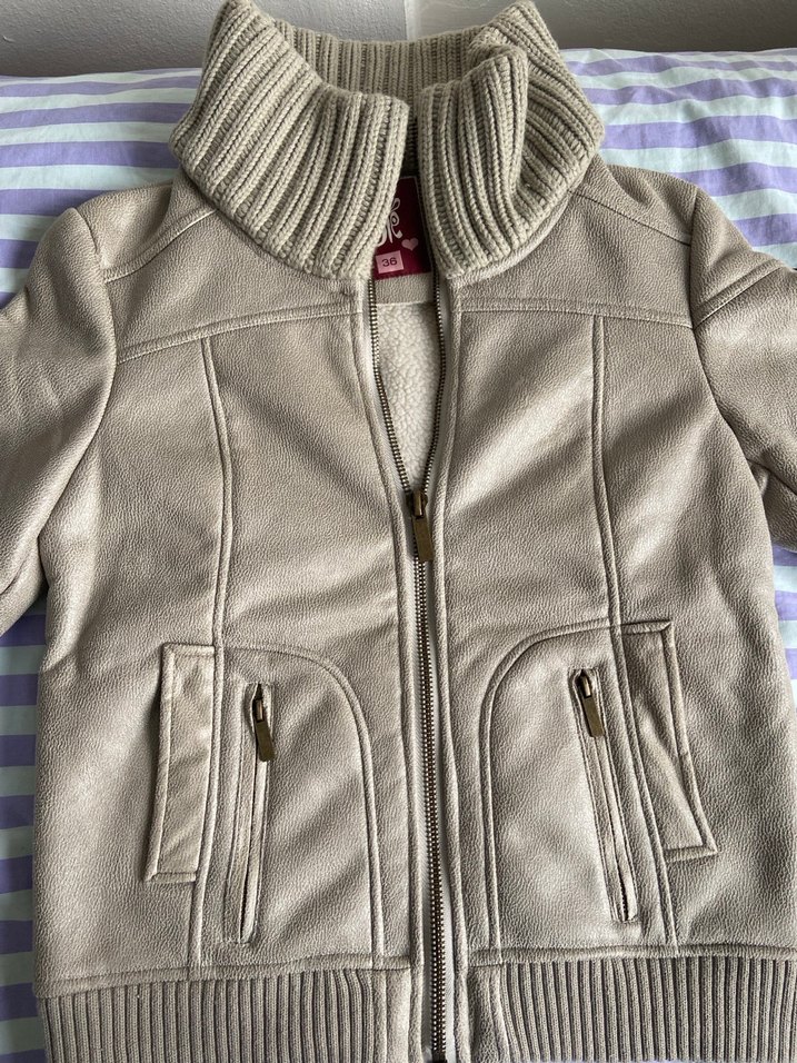 Bej deri fermuarlı, uzun kollu, yakalı ve fitted kesim kadın ceket. Rahat ve günlük kullanıma uygun, triko detaylı yakası ve etek ucu bulunur.