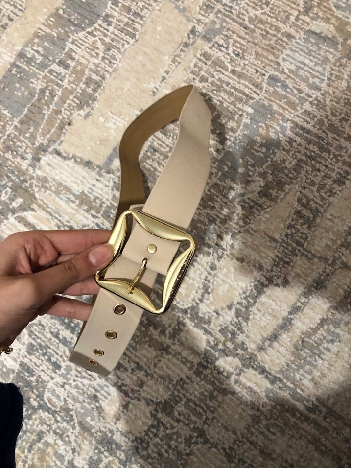 Altın renk tokalı, hafif bej deri kadın kemeri. Bohem tarzda, yumuşak dokulu ve vintage Paris havası taşıyor.