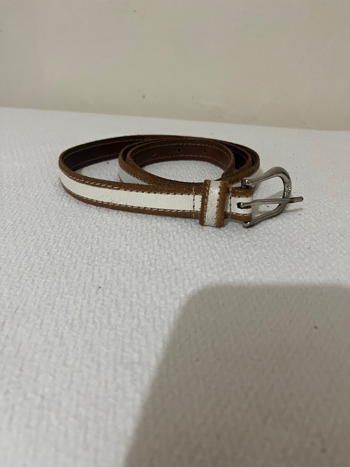 Açık bej renkte deri kadın kemeri, sade tokasıyla minimalist ve basic tarzlara uygun.uzunlugu 115 mt