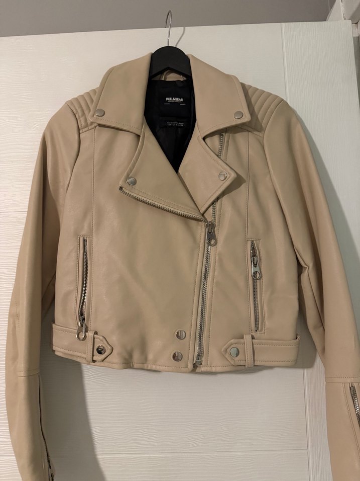 Bej deri kadın ceket, yaka kısmında kesik detay ve düğmeli tasarıma sahip. Kısa boy ve normal kesim, günlük rahat sokak stili için uygun.
