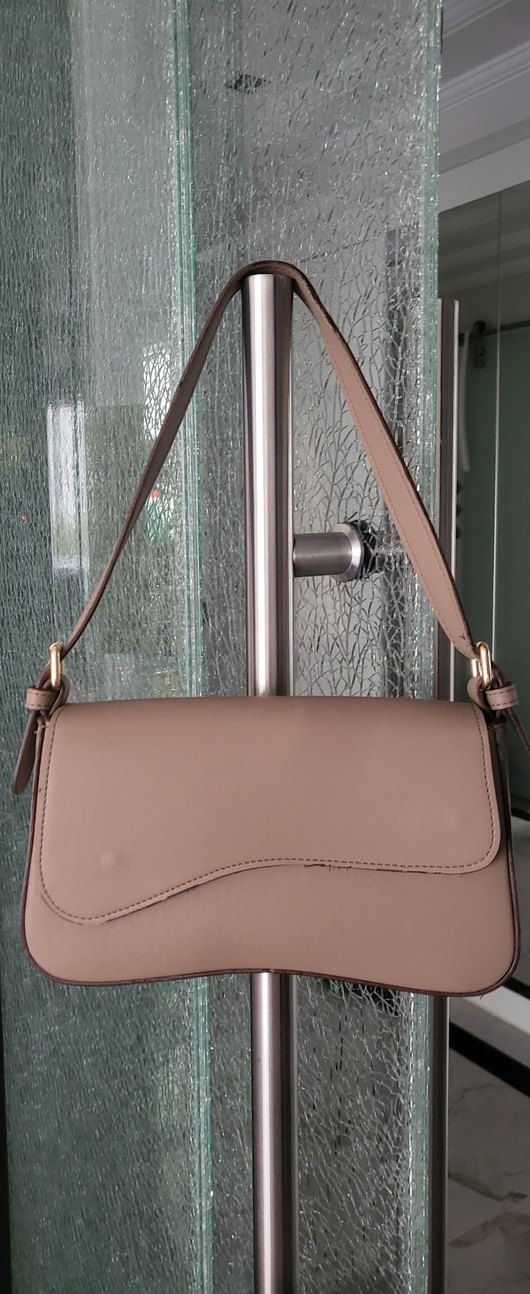 Bej deri omuz çantası, tokalı askısı ve düz yüzeyiyle çağdaş Paris tarzını klasik zarafetle yansıtıyor. En 25 cm / y 15 cm / d 6cm