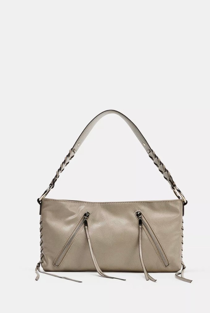 Bej deri kadın omuz çantası, fermuarlı ve minimalist çağdaş tasarıma sahiptir. Düz yüzeyli ve örgülü askılı, günlük kullanıma uygundur.