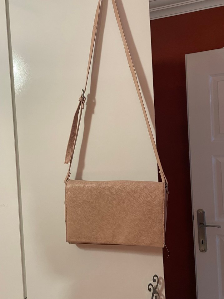 Bej deri kadın omuz çantası, sade ve desensiz tasarımıyla günlük kullanıma uygun, ayarlanabilir askıya sahiptir.