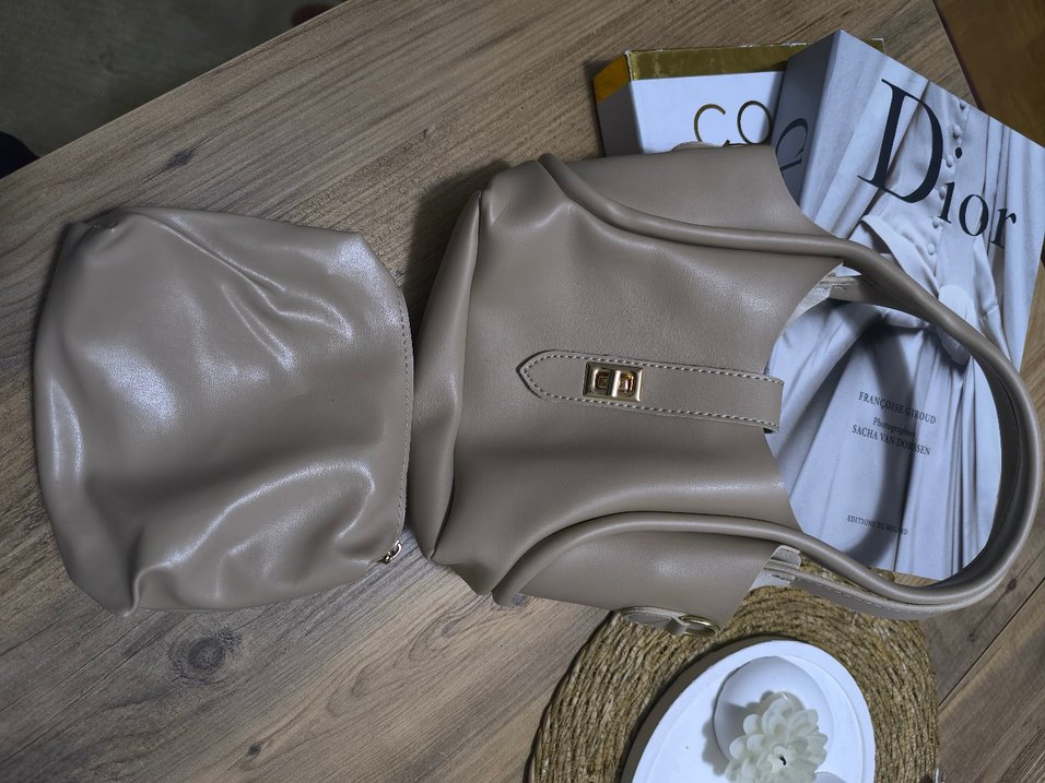 Bej deri kadına özel, tokalı detaylı, desen içermeyen, çağdaş tarzda omuz çantası. Günlük kullanıma uygundur.