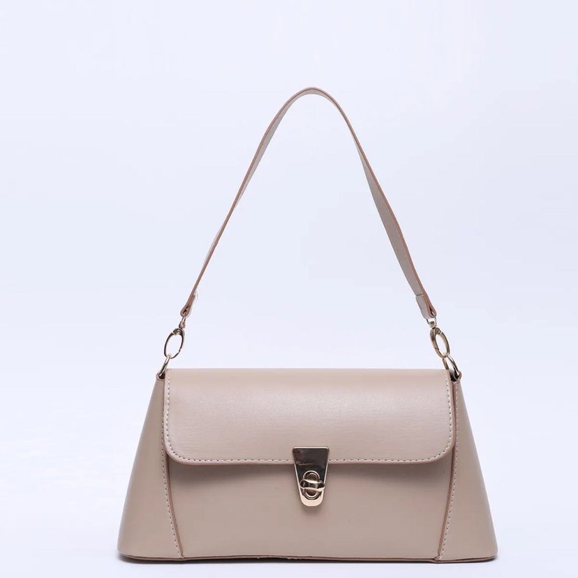 Bej deri kadın omuz çantası, tokalı kapanışlı ve minimalist tasarımlı, günlük kullanıma uygundur. Modern klasik stilde, desensiz ve pürüzsüz yüzeye sahiptir.