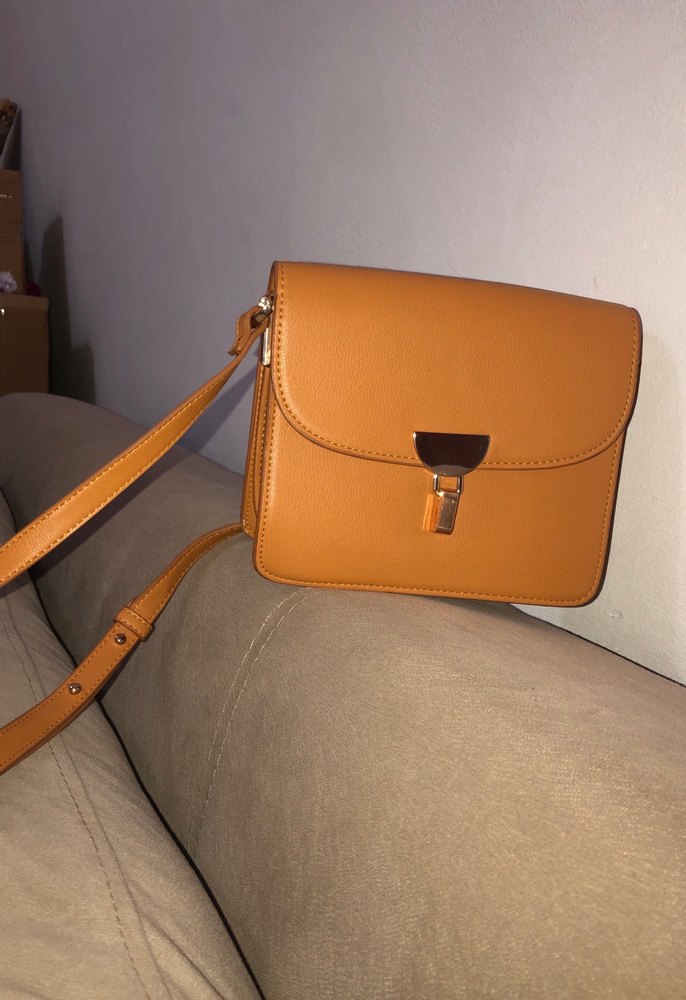 Orijinal MNG Bej deri kadın omuz çantası, tokalı kapanış ve ayarlanabilir askıya sahip. Günlük sokak tarzına uygun minimalist tasarım.