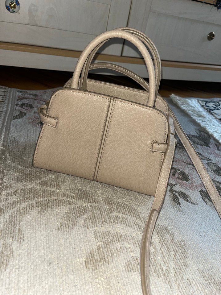 Bej renkte, deri malzemeden yapılmış, tokalı ve çift saplı kadın çantasıdır. Pastel tonlarda , defosu yoktur
