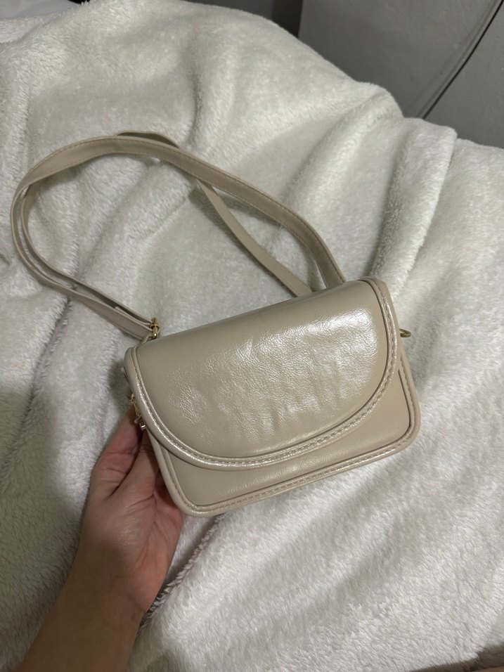 Bej renkli deri kadın omuz çantası, tokalı kapaklı ve sade modern klasik tasarıma sahip. Günlük kullanım için uygun, desensiz yüzeye sahip. Kapanan mağaza ürünüdür
