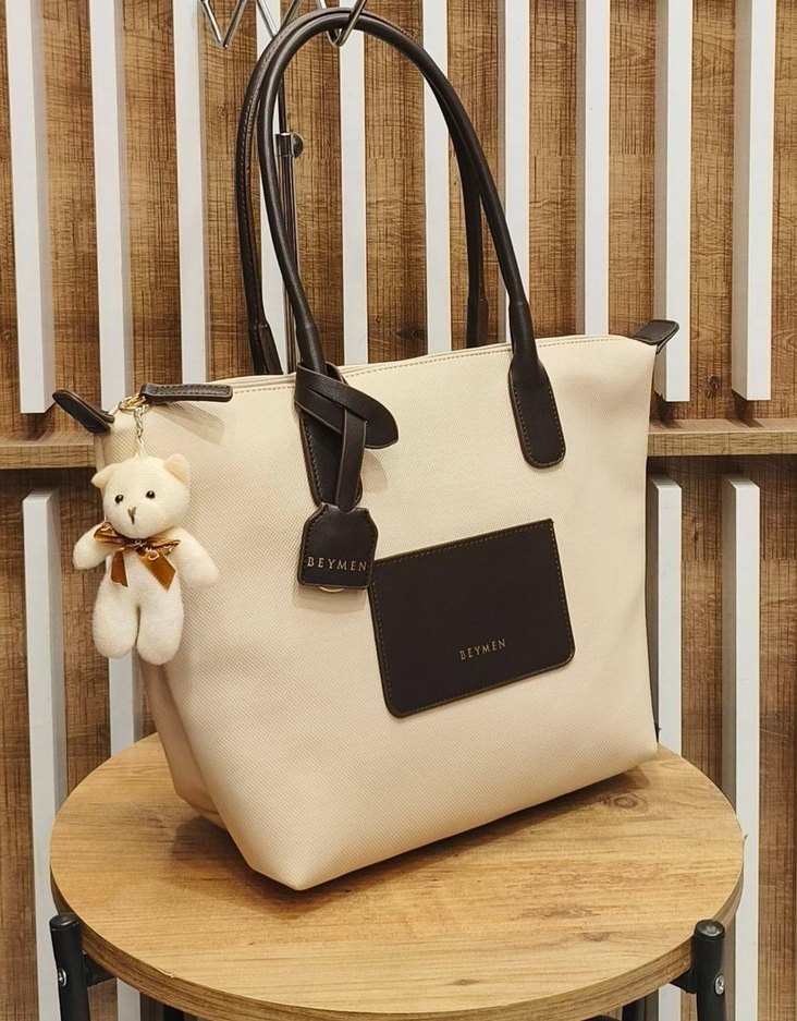 Bej deri kadın omuz çantası, baskılı detaylar ve püskül aksesuarıyla. Koyu renk sapları ve küçük ayıcık aksesuarı bulunur. BEYMEN NY LUXE DAİLY Sıfır Etiketli Ebat 29*33 cm İthal ürünlerdir
