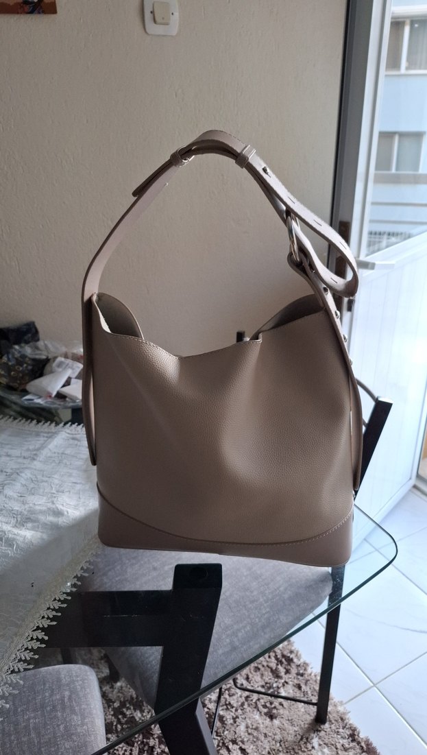 Bej deri kadın çantası tokalı kayışa ve desensiz sade tasarıma sahiptir. Günlük kullanıma uygun, minimalist ve çağdaş tarzda.