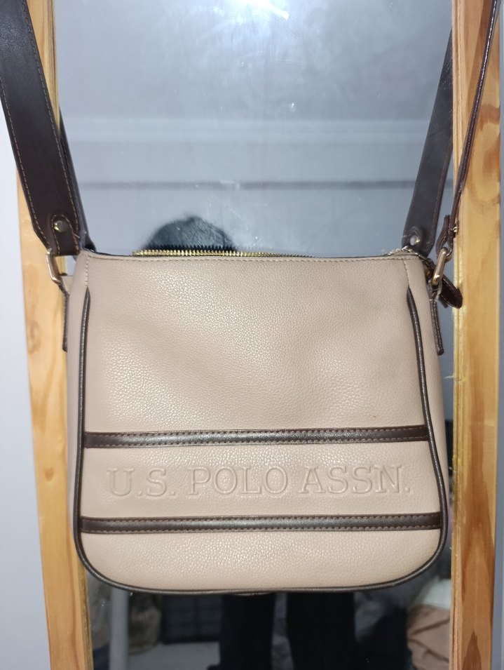 Bej deri kadın omuz çantası, baskılı desen ve fermuarlı kapanışa sahip, U.S. Polo Assn. markalı, trend sokak stili için uygun.