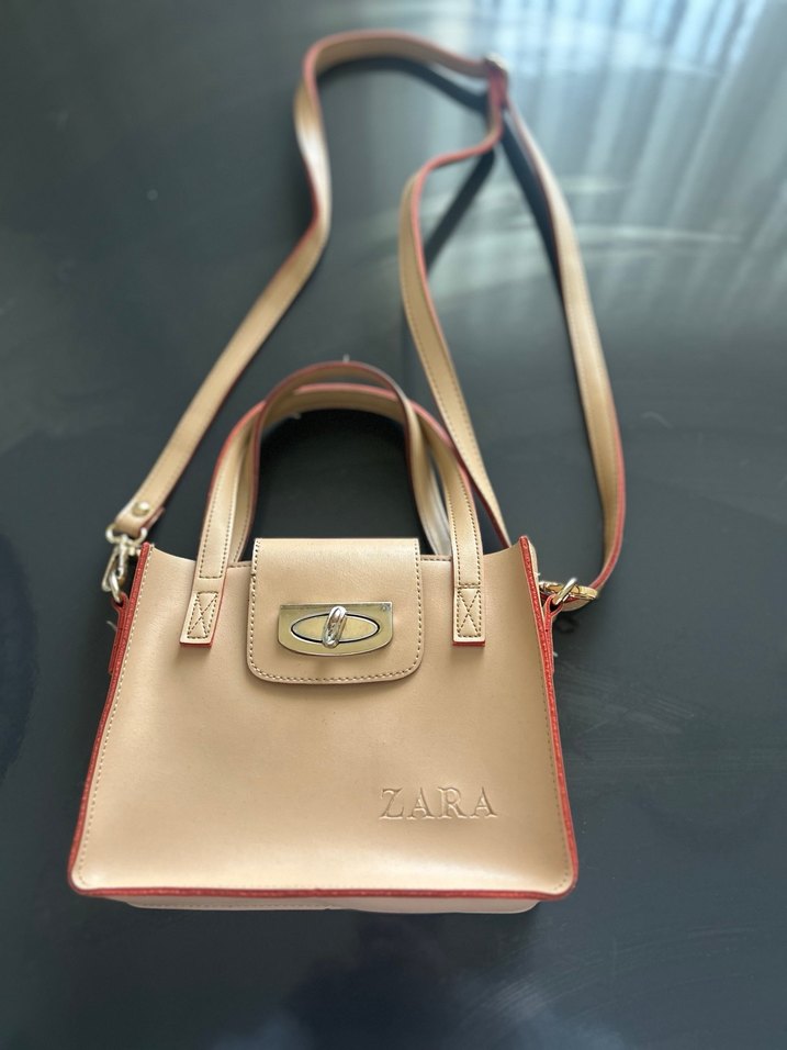 Bej renkte, tokalı kapaklı deri kadın çantası. Kısa sap ve uzun askı seçenekleriyle kullanımı kolaydır. ZARA markasına ait çağdaş minimalist tasarım.