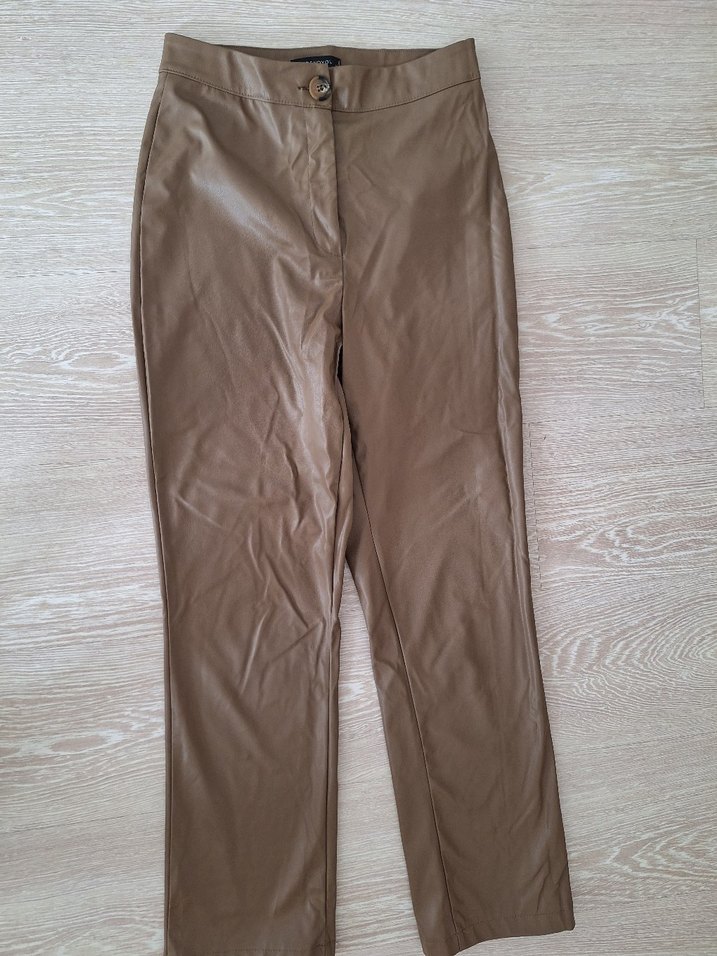 Bej renkli, düğmeli, deri kumaştan yapılmış, normal midi boy ve regular fit kadın pantolon. Ofis kullanımı için uygundur. RENGİ ÇOK GÜZEL NET ÇIKMAMIŞ MİLLANIN DERİ PANTOLONU BİLEK BOY 100 CM