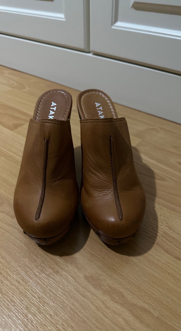 Bej deri kadın terlik, platform topuklu ve tokalı tasarıma sahip. Minimalist ve sade stil, günlük kullanım için uygundur. Marka: ATAKÖY