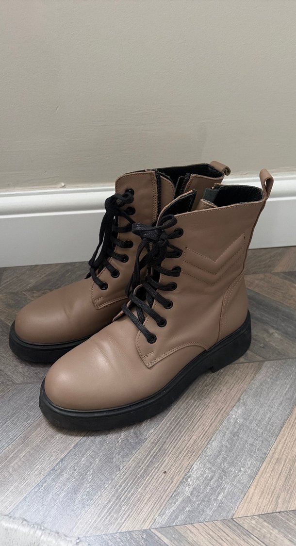 Bej deri kadın bot, platform topuklu ve bağcıklı tasarıma sahip. Sokak stiline uygun, günlük kullanıma ideal.