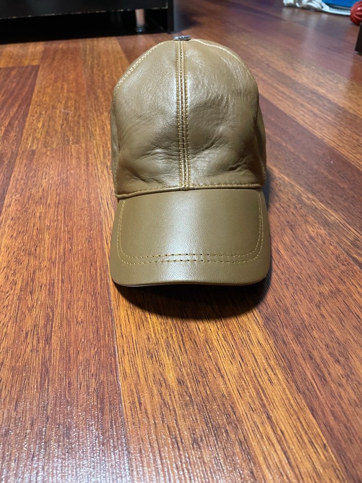 Parlak yüzeyli, kürklü detaylı bej deri kadın şapka, minimal ve sokak tarzını birleştirir.