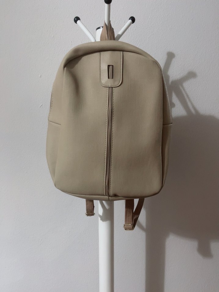 Bej renkte deri sırt çantası, minimal tasarıma sahip ve fermuarlı kapamalı. Günlük kullanıma uygun, çağdaş ve desensiz yapıda.