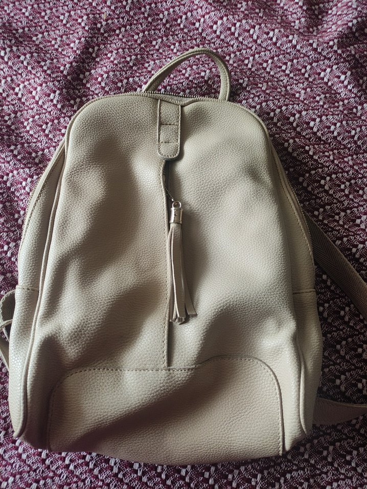 Bej renkte deri sırt çantası, fermuarlı ve desen içermeyen minimalist bohem tarzda, günlük kullanıma uygun defolari var dış kısmı temiz