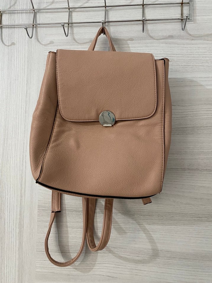 Bej renkte deri sırt çantası, tokalı kapaklı ve minimal tasarıma sahip. Günlük sokak stiline uygun, pastel ve desensiz bir görünüme sahiptir.