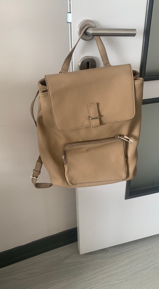 Bej renkli, tokalı kapaklı ve ön fermuarlı cepli deri kadın sırt çantası, günlük kullanım için minimalist tarzda.