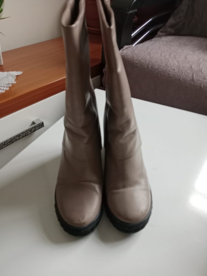 Bej deri kadın stiletto botlar, tokalı detaylara sahip. Düz desensiz yüzeyiyle günlük kullanıma uygun, trend rahat stile sahiptir.