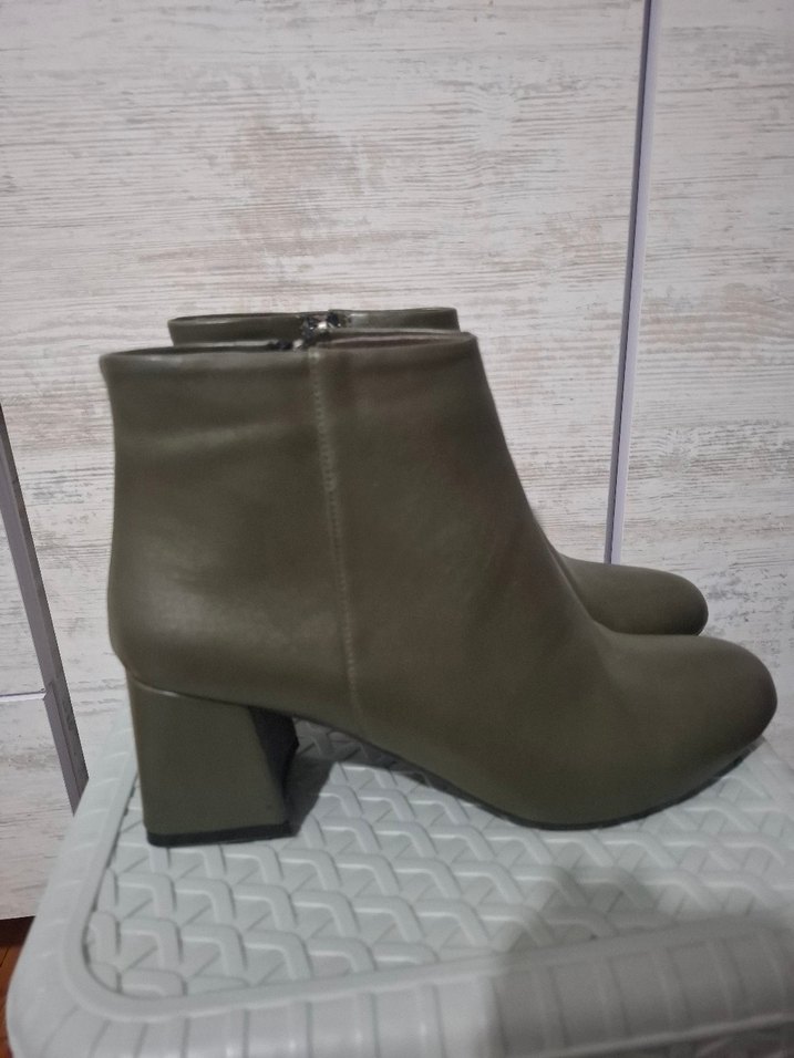 Bej deri kadın bot, kalın topuklu ve tokalı detaylıdır. Minimalist ve şık günlük kullanım için uygundur.