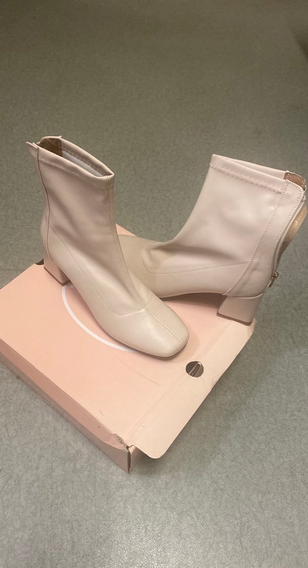 Bej deri kadın botlar, blok topuklu ve desensiz tasarıma sahiptir. Trendy rahat stil ve zahmetsiz şıklık sunar, romantik akşamlar ve sokak stiline uygundur.